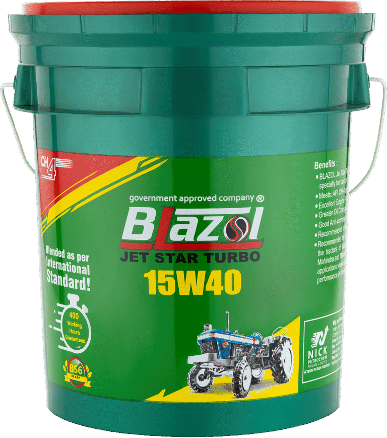 BLAZOL JET STAR TURBO 15W-40 TRACTOR OIL (CH-4) diesel engine oil formulated with performance additives to deliver superior performance in tractor engines meeting TREM-IIIA emission norms. The synthetic blend with balanced performance additives helps maintain viscosity for longer duration providing extended drain capability. It offers superior protection against wear, deposits, and maintains engine cleanliness